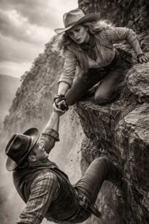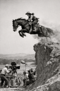 Just when it seemed the scene would reach an end without injury the great fleet of extras, stuntpeople, and their vehicles traveled over what appeared to be a level plain. It was anything but. The ground was littered with prairie dog holes some two feet across and others in clusters or towns. Before filming began the production company sent a crew out to fill in gaping trenches with dirt. The work was only done on the area that would be contained in the shot. The ground wasn’t touched beyond that. Vera skillfully guided Blackie through the potentially hazardous section of prairie. He cleared the holes with big strides and didn’t stop until they were out of harm’s way.